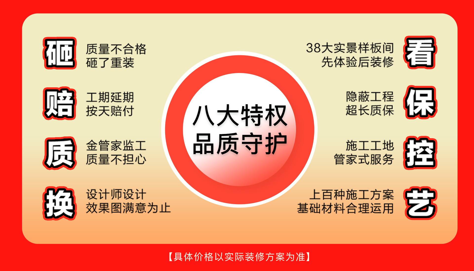 同時,我們鄭重承諾八大特權品質守護,涵蓋從材料、工藝、工期到售后的全流程,具體包括但不限于:質量不合格砸掉重裝,工期延期按天賠付,金管家建工安全放心,設計師設計到您滿意為止,38大實景樣板間先體驗后裝修,隱蔽工程超長質保等,用白紙黑字的承諾,讓您徹底安心。